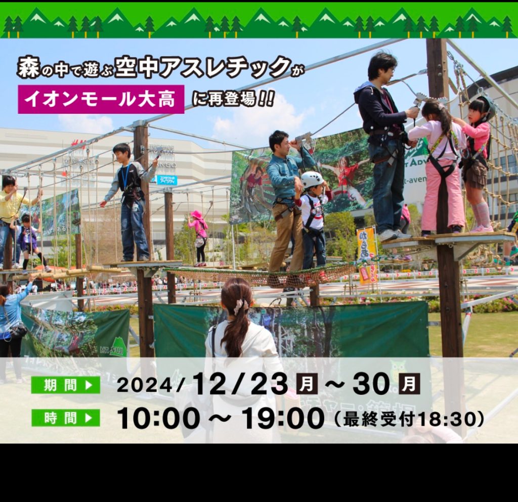 12/23(月)~30(月)の8日間、イオンモール大高の1階グリーンコートに『フォレストアドベンチャー・モバイルコース』が再登場します!今年最後の挑戦、思い出を作りにぜひいらしてください! 【モバイルコース開催概要】[場所]イオンモール大高1Fグリ... -