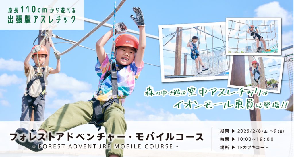 2/8(土)〜9(日)の2日間イオンモール東員の1階カブキコートに『フォレストアドベンチャー・モバイルコース』が初登場します!ハーネスを装着して体験出来るアスレチック‼️初めての方も、ぜひ挑戦しに来てくださいね。 【モバイルコース開催概要】[場所... -
