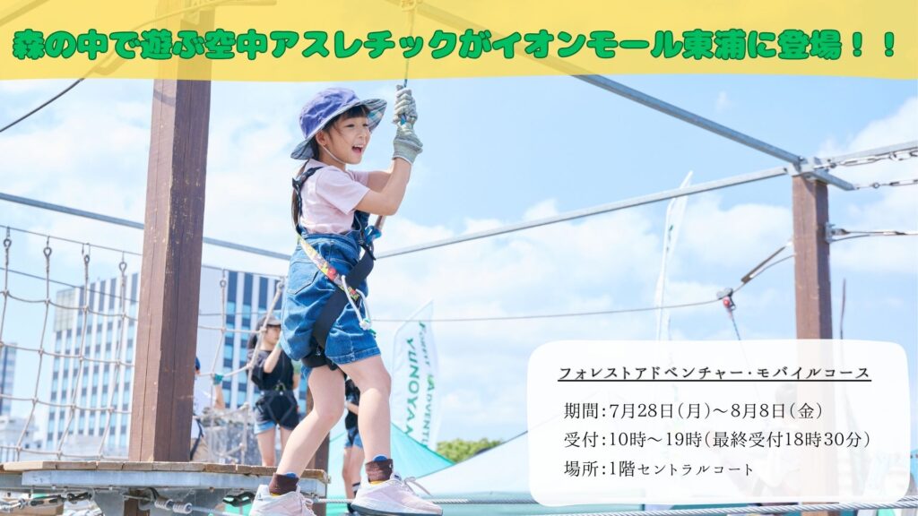 『イオンモール東浦』の1階セントラルコートに、スリル満点の空中アスレチック「フォレストアドベンチャー・モバイルコース」が登場します。今年の夏は、屋内で涼しくアクティブな体験を挑戦しに来てください! 【出店概要】場所:イオンモール東浦 セント...