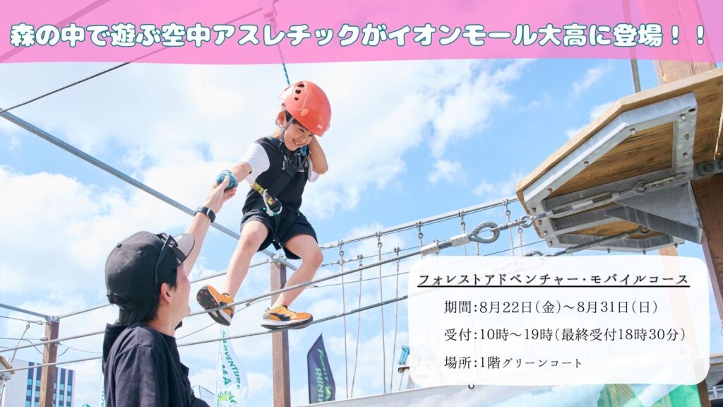 イオンモール大高の1階グリーンコートに、スリル満点の空中アスレチック「フォレストアドベンチャー・モバイルコース」が今年の夏も出店します!家族や友達と一緒に、涼しい屋内でスリルと達成感あふれる夏の冒険を楽しもう! 【出店概要】[場所] イオ... -