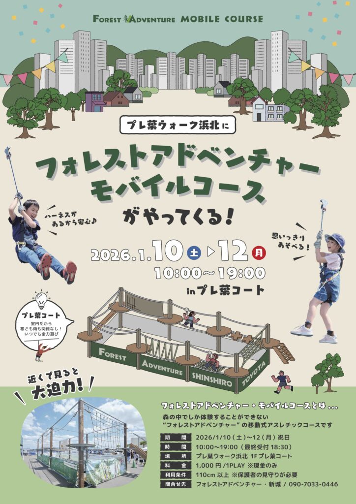2026年最初の出店として、プレ葉ウォーク浜北にモバイルコースが登場します!昨年6月の出店時、多くのお客様に体験いただき大好評だったモバイルコース。新年最初の空中アスレチック体験にぜひお越しください。 【出店概要】[開催日] 1/10(土)・11(... -
