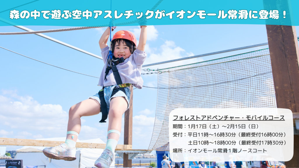 イオンモール常滑1Fノースコートにフォレストアドベンチャー・モバイルコースが初登場!今回は1ヶ月間のロング開催、たっぷり期間があるので、ご都合の良い日にぜひお越しください。 【出店概要】[場所]イオンモール常滑1Fノースコート[住所]愛知県常... -